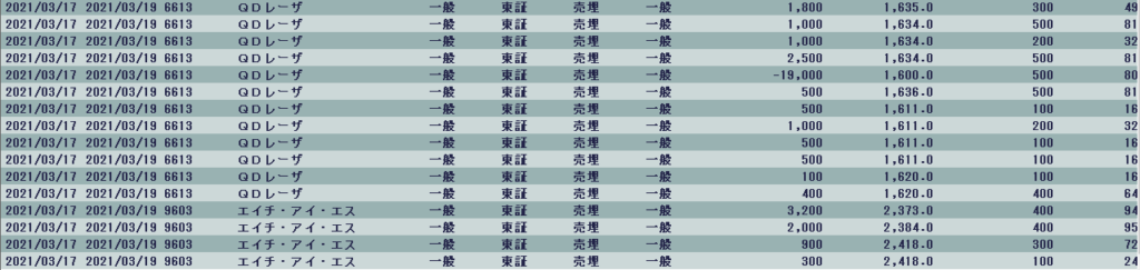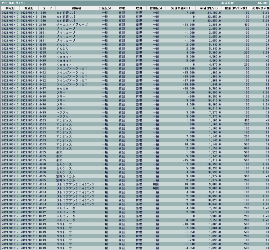 安く寄った後は小幅な値動きで材料株が動くことをイメージ。楽天は安寄りするが、昨日上場の4432ウイングアークがだいぶ高く寄りそうだったので、朝はここについていこうとして、、、撃沈。指数が落ち着いたら戻すかと思ったが、今日の5分足は鬼。上場初日の昨日でしこった玉がせっせせっせと売られてもう戻せる様子がなかったので、徐々に撤退。ここで▲8万と、同じく朝の強さからいずれブレイクを期待したQDレーザが最後まで飛ばずに▲4万。ここは何回もやられた。そのほかもちょくちょくロスカットがあって、今日はこの程度ですんで助かった、という思い。