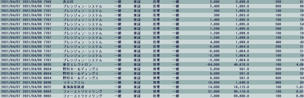いったん下をやったものの、指数はそこからの戻しもそれなりに強く底値も堅そうだったので、後場はロング転換。7707PSS、4165プレイド、4192スパイダーのマザーズ3銘柄と主力で圧倒的に強かった6920レーザーテックをロングで何度か回転させた。今日は相場が思ったより強かったけど、指数の動きが概ね想定通りだったので比較的やりやすい一日だった。