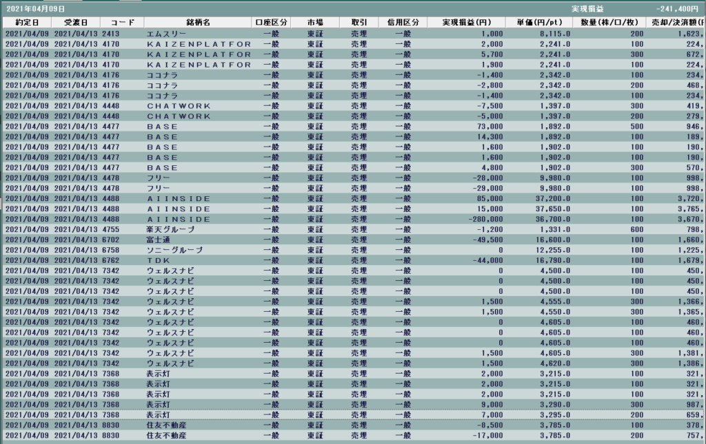 エムスリー↑+1,000、KAIZEN↑+9,600、ココナラ↑▲5,600、CHATWORK↑▲12,500、BASE↑+95,300、フリー↑▲57,000、AIINSIDE↑▲180,000、楽天↑▲1,200、富士通↑▲49,500、ソニー↑0、TDK↑▲44,000、ウェルスナビ↑+6,000、表示灯↑+22,000、住友不↑▲25,500