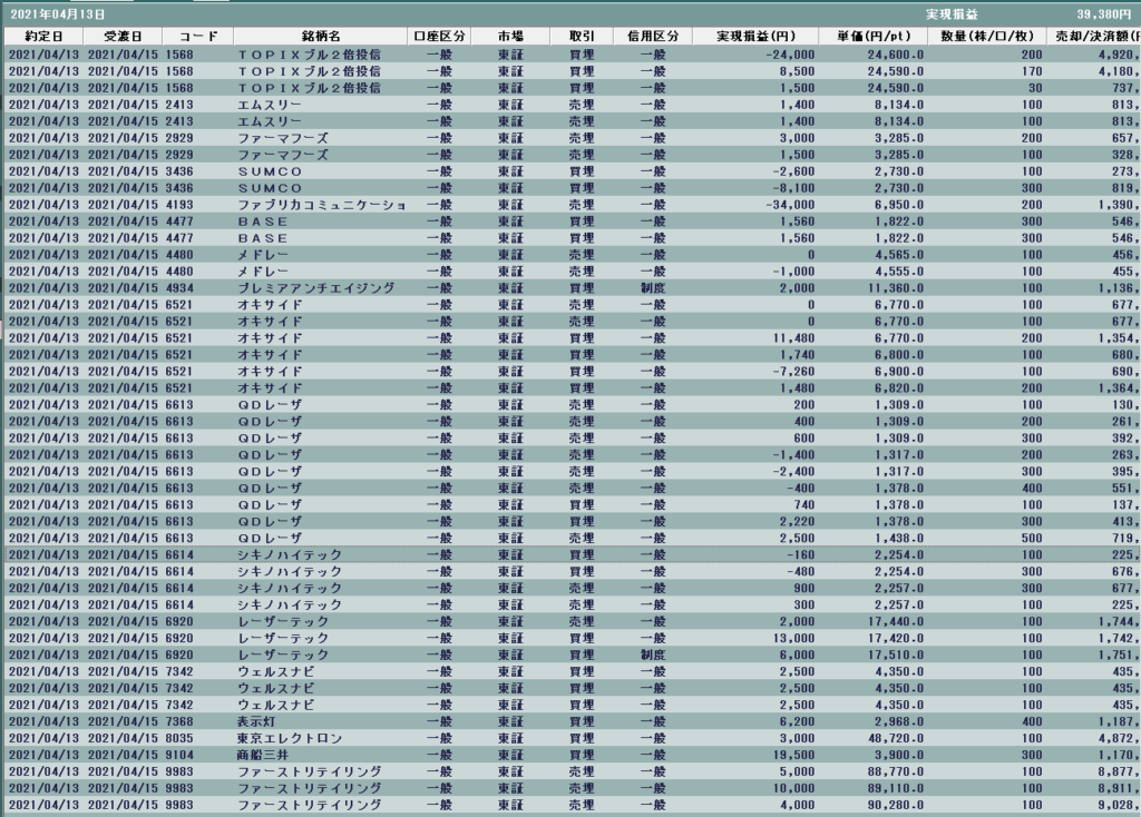 今日から1570日経レバだけでなく1568TOPIXブル2倍もウォッチ銘柄に採用します。今日も高く寄り付いた後はダレて前日比マイナス局面はありそう、という想定で基本ショートスタンス。安く寄った半導体関連を下値堅さ感じて早期撤退できたので何とか助かりました。結局ショートでうまくいったのは商船三井だけであとは相場の流れにやられました。弱い日に全力ロングで強い日にショート…逆行ってしまいます。