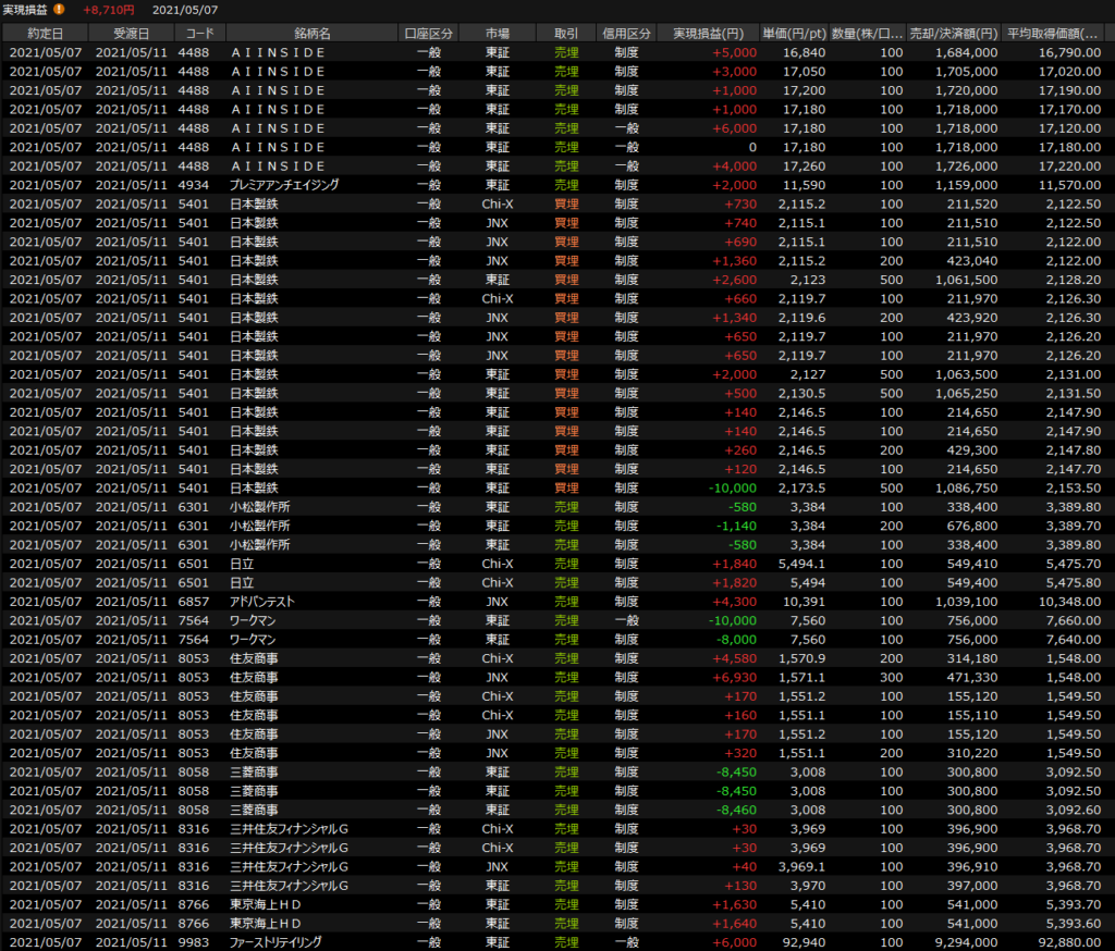 5/10(月)AIINSとJIGSAW<デイトレ結果> 2021.05.10