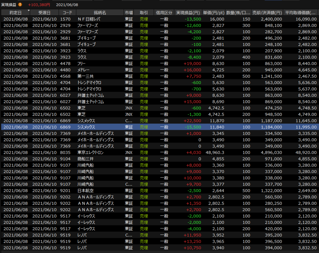 6/7(月)ほぼ寄り天<デイトレ結果> 2021.06.07