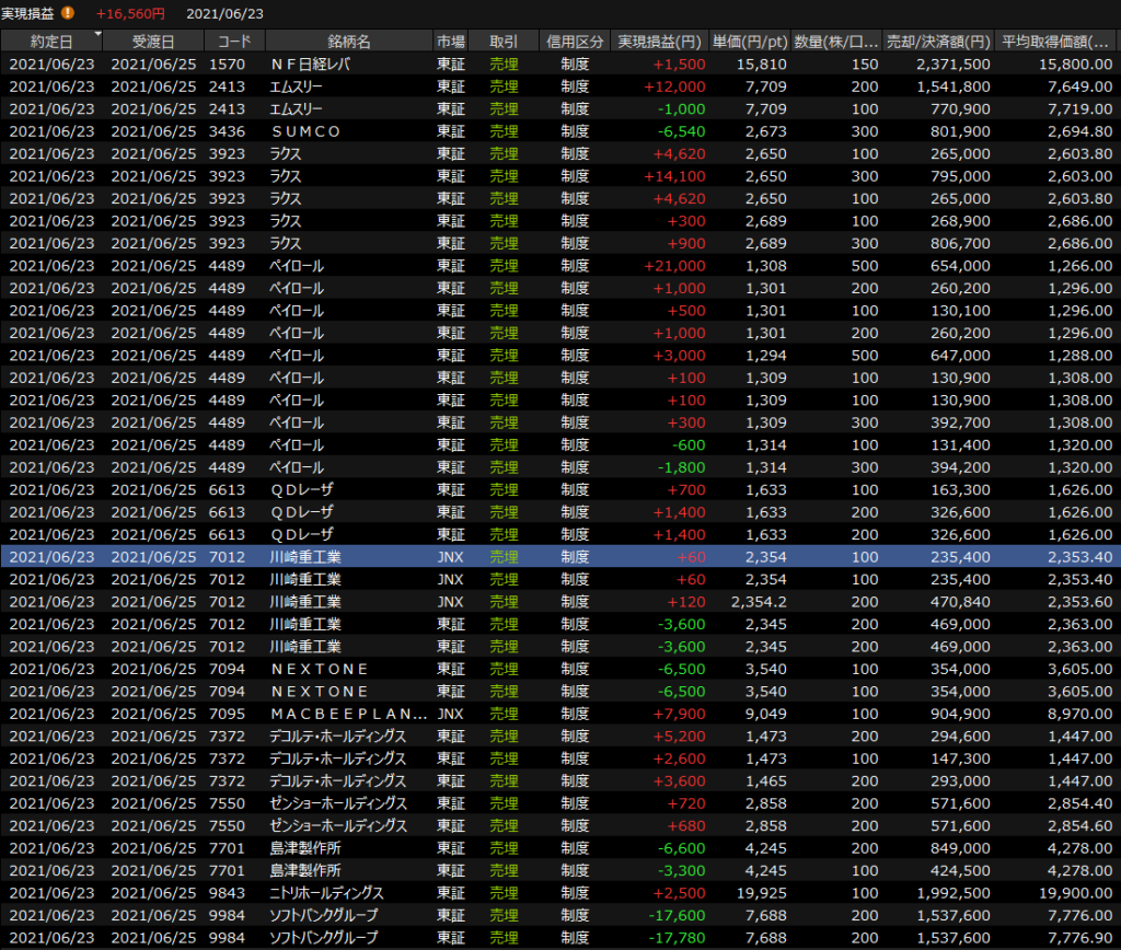 6/22(火)いつものやつ<デイトレ結果> 2021.06.22