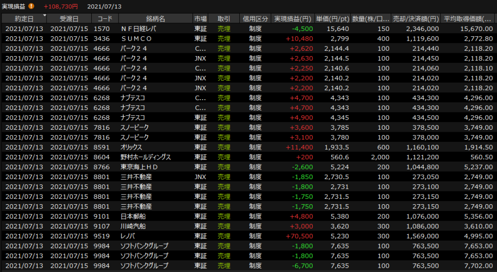 7/14(水)伸びない<デイトレ結果> 2021.07.14