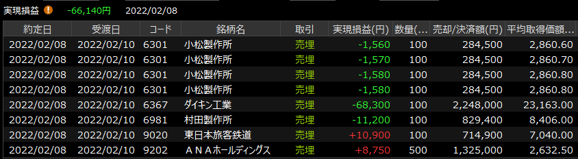 2/7(月)しっくりこない下げ<デイトレ結果> 2022.02.07