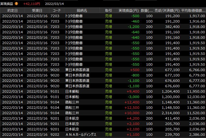 3/15(月)自動車<デイトレ結果> 2022.03.15