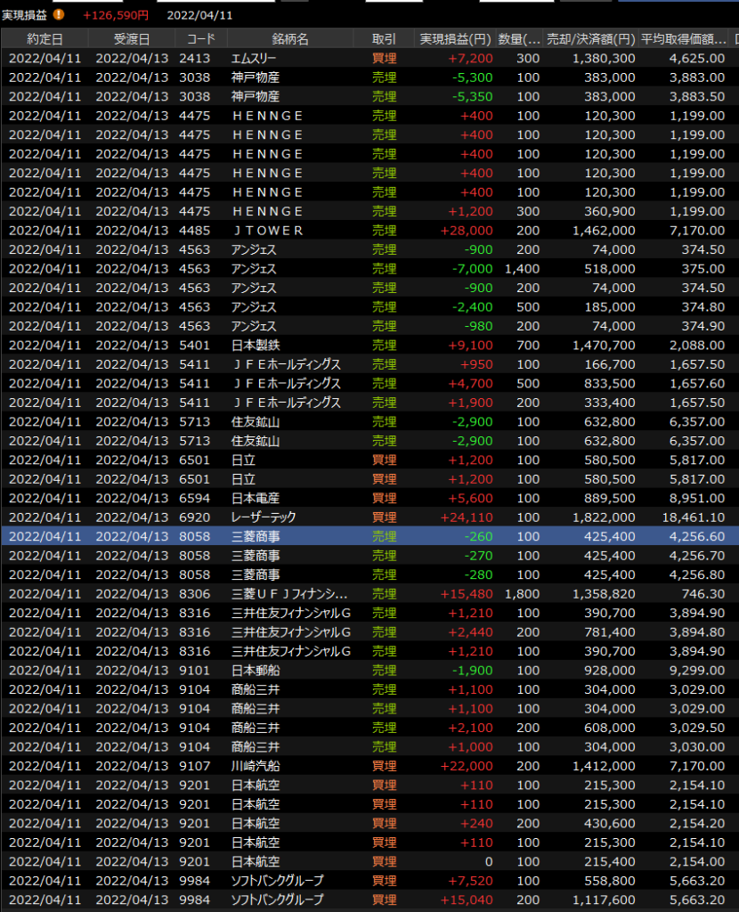 4/12(火)大幅続落<デイトレ結果> 2022.04.12