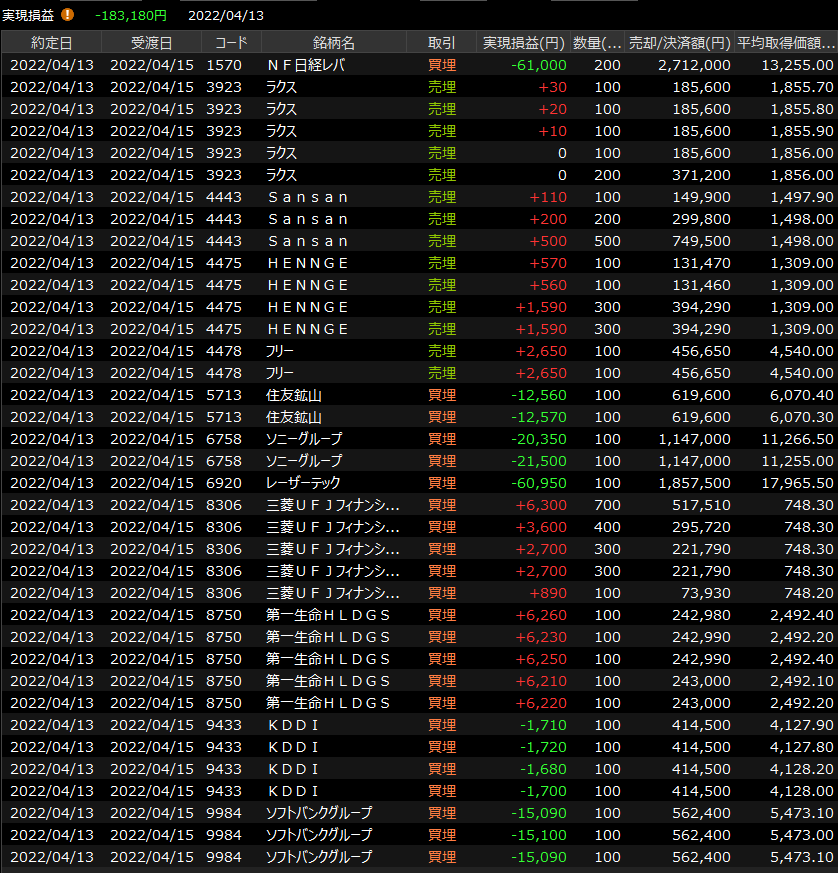 4/14(木)グロース伸びず<デイトレ結果> 2022.04.14