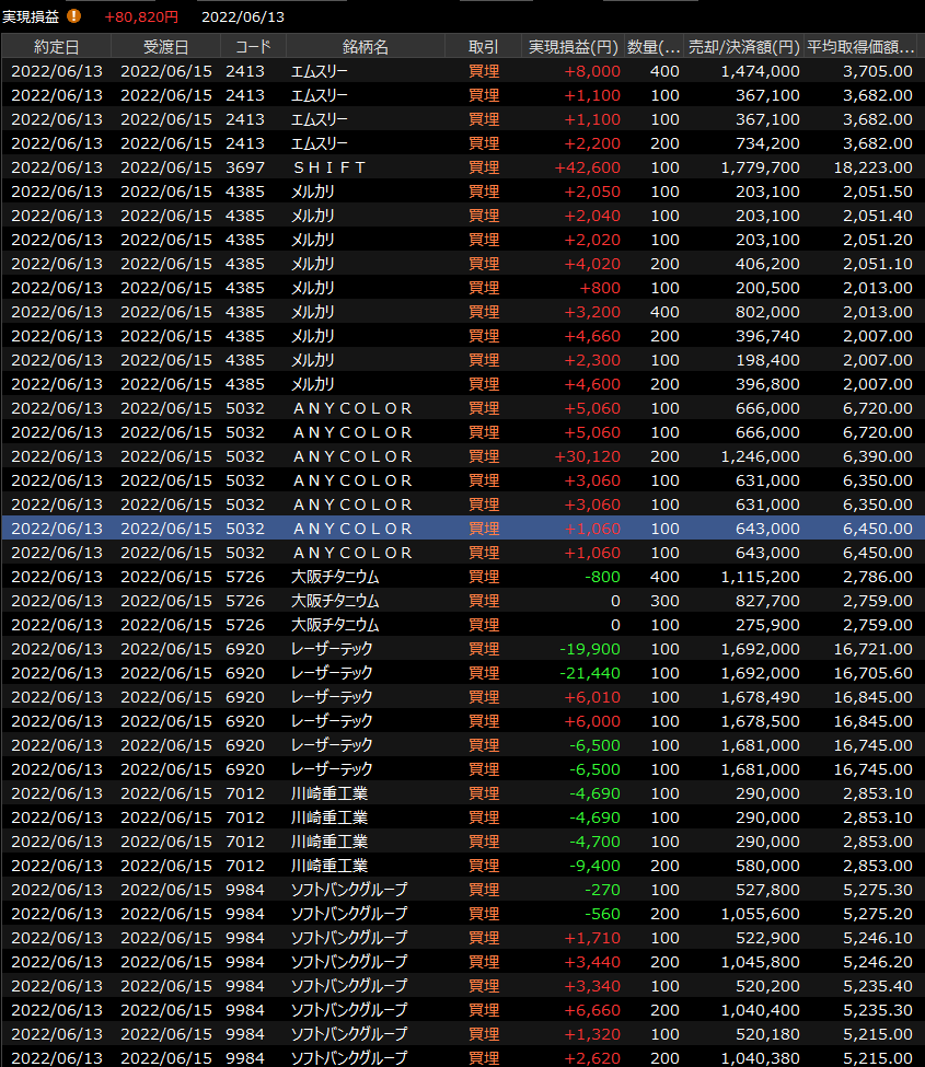 6/14(火)三空<デイトレ結果> 2022.06.14