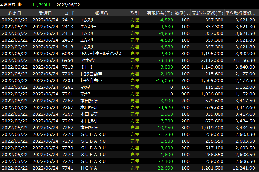 6/23(木)乱高下につかまる<デイトレ結果> 2022.06.23
