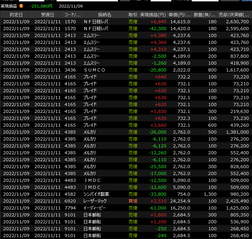 11/10(木)底堅い<デイトレ結果> 2022.11.10