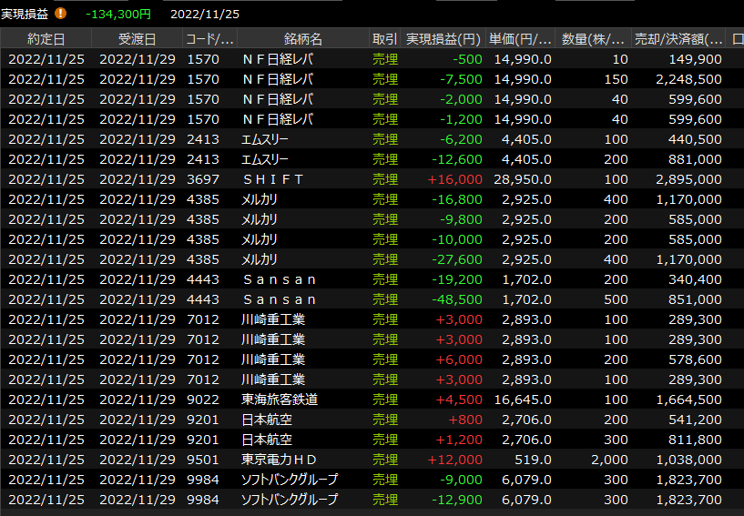 11/28(月)最悪<デイトレ結果> 2022.11.28