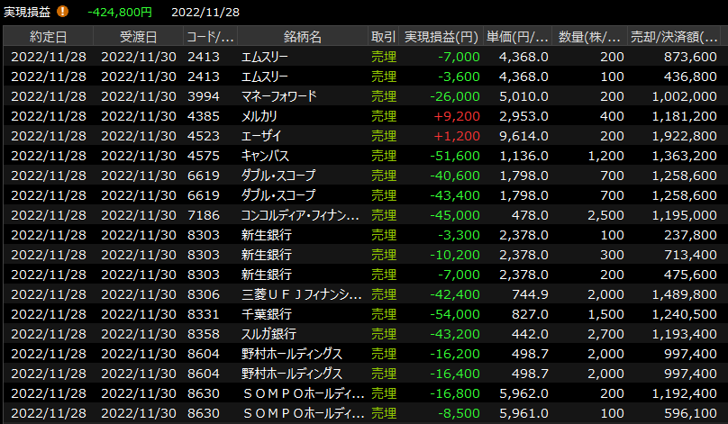 11/29(火)今日も微妙な<デイトレ結果> 2022.11.29