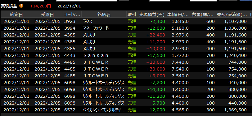 11/30(水)マザーズ小休止<デイトレ結果> 2022.11.30