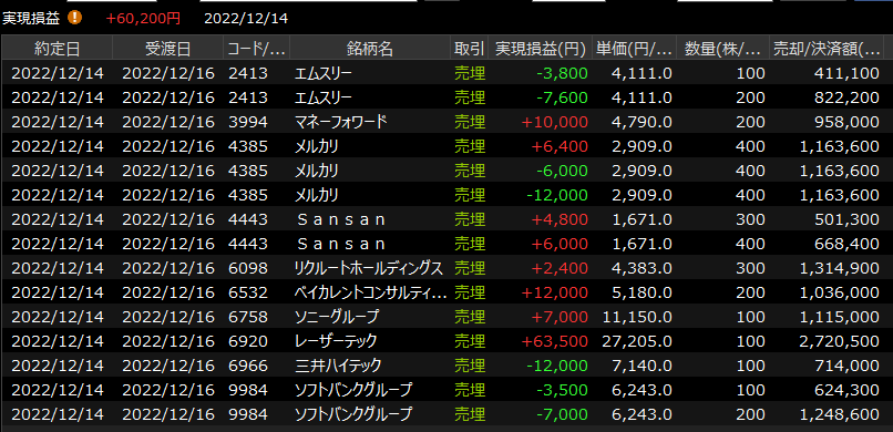 12/15(木)後場沈むのかよ<デイトレ結果> 2022.12.15