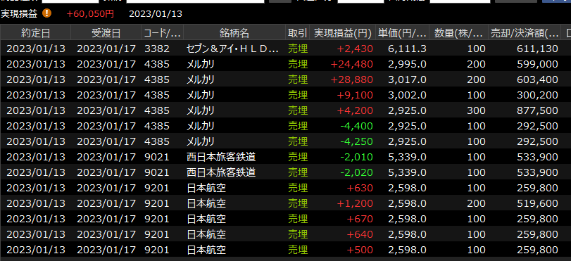 1/12(木)利確売り優勢<デイトレ結果> 2023.01.12