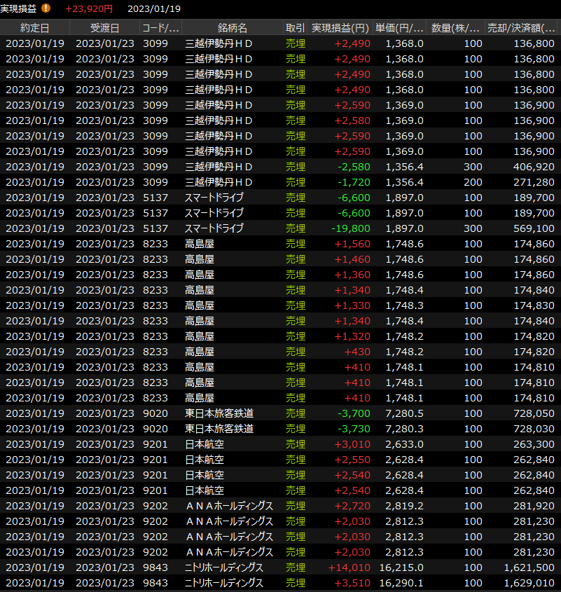 1/20(金)インバウンド強い<デイトレ結果> 2023.01.20
