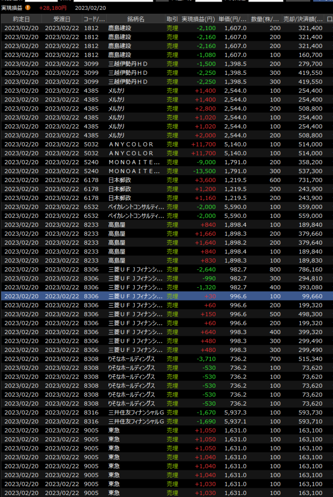 2/17(金)グロース総崩れ<デイトレ結果> 2023.02.17