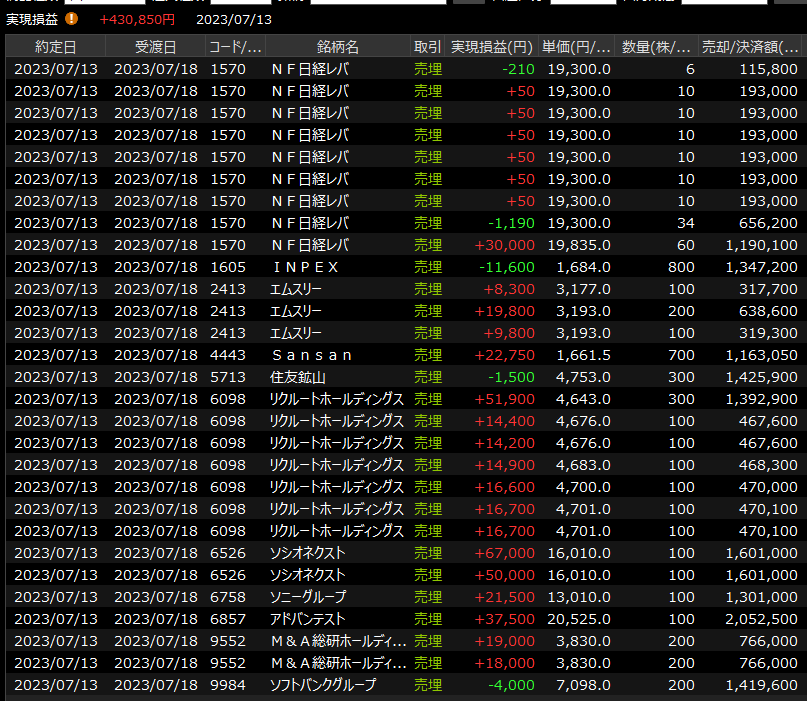 7/14(金)SQ波乱<デイトレ結果> 2023.07.14