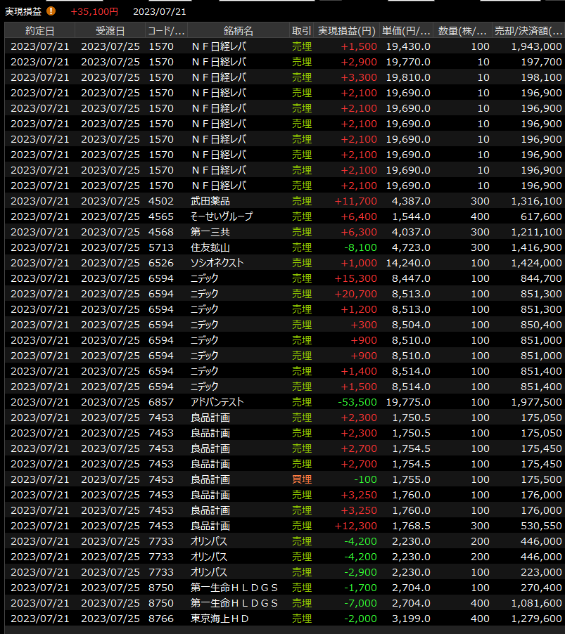 7/20(木)半導体売られる<デイトレ結果> 2023.07.20