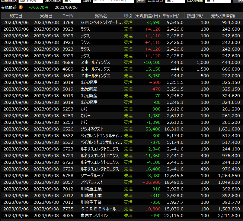 9/5(火)天国から地獄<デイトレ結果> 2023.09.05