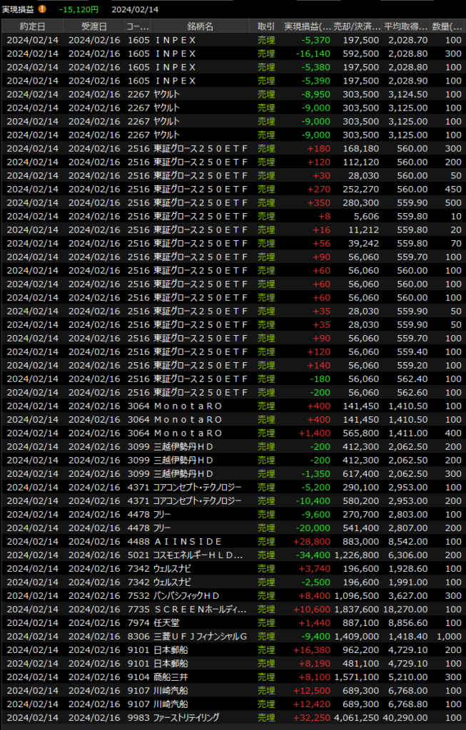 デイトレはファストリ、海運など急落なさそうなところでリスクをとらなかったことは悪くなかったのですが、この中でINPEX、コスモ、ヤクルトなど伏兵に損失を広げられてうまくいきませんでした。こんな雰囲気いい時に連敗とは凹みますが、割り切ってまた明日。
