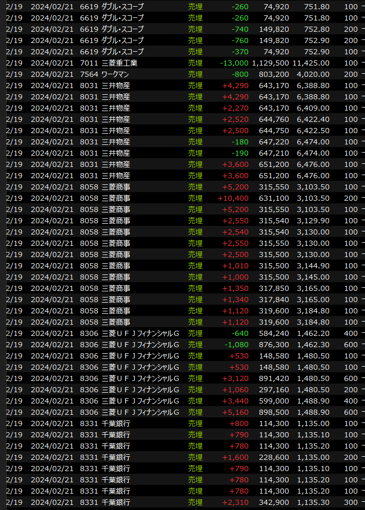 デイトレは金曜にS高で持ちこしたヘッドウォータースを寄り付きで返済(+18万)、その後のデイでも「半導体以外」を意識して細々と積んでいきました。金融、商社、建設あたりを中心に徐々に銘柄を変えて前場2周、後場1周、取引詳細見ても今日は動いたなー、という一日でした。
