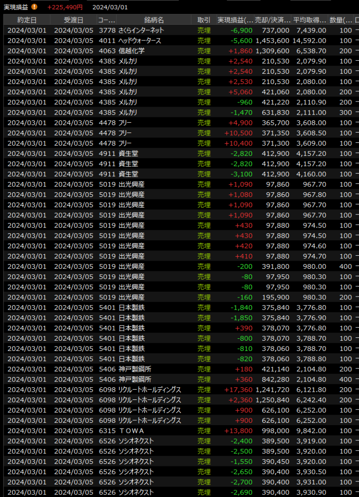 デイトレはルネサス、ソシオ、TOWAなどの半導体やリクルートメルカリなどの新興グロース、ふくおかFG、鉄鋼などのバリューなど幅広いセクターをやってソシオ以外は比較的うまくいきました。午後は海運を軸に2周目。川崎汽が思った以上にきました。