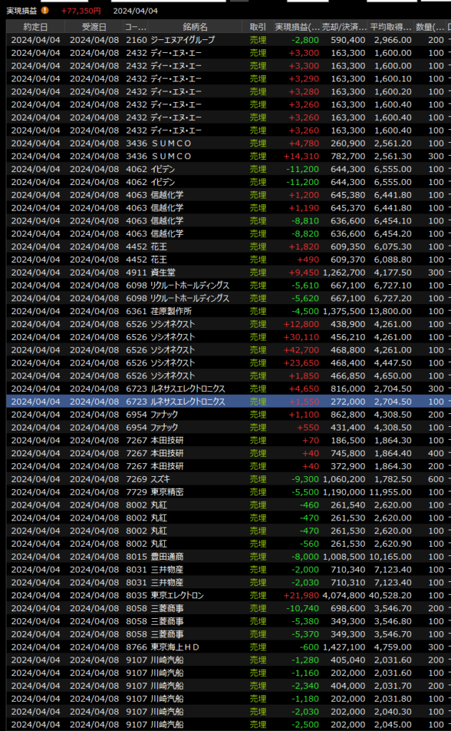 デイトレはソシオに途中で気づいて入った分が奏功してプラスでしたが、4日連続で場中の利益を大きく削って終えています。回転が全く効いてないということなので、指数大幅高とは言え、まずい状況はあまり変わってない印象。