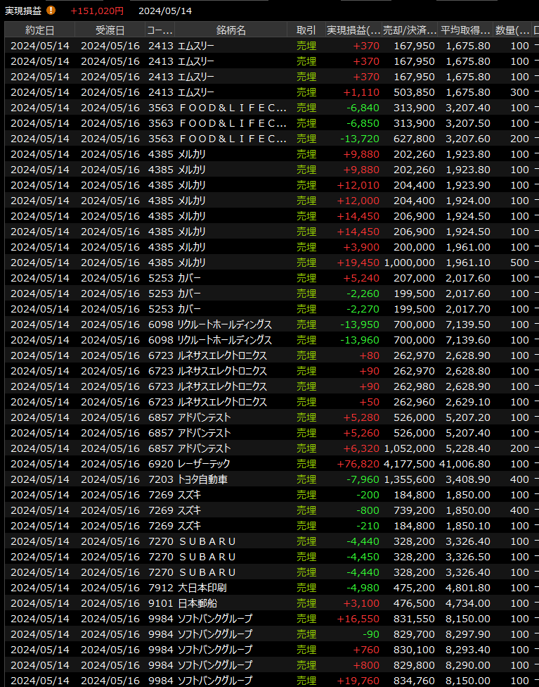 デイトレはメルカリ、レーザー、アドテスト、SBGなどいい銘柄結構もってて一時は含み益もけっこうあったのですが、「今日は引っ張るべき」と握っているうちに徐々に削られるGW後毎日のように見ている展開。ただ後場後半になんとか持ち直して昨日のリベンジはできたので良かったです。