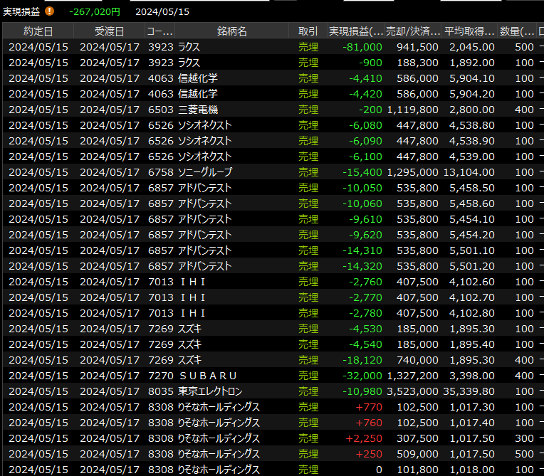 デイトレはなぜか買ってしまったラクスの寄り近辺の飛びつきが大きく響いて、しかも少しではありますが禁止事項のナンピンをしてしまったことで今日は猛省。ラクスは9か月前にも急騰からの大失速を演じていて、とにかく悪い癖のある銘柄、この程度も見極めないで入るとは下手の極みです。勝てると思ったソニーやら他の半導体もけっこうやられてひどいもんでした。