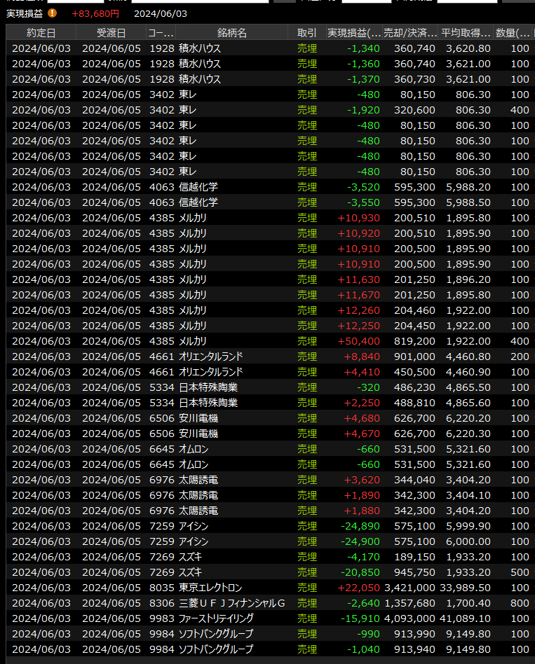 デイトレは今日の主役のひとつメルカリをしっかり手掛けられたのが良かったです。東エレク、安川、オリエンタルランドあたりも良かったのですが、14時頃の国交省からのニュースでスズキとアイシンが被弾して後場のパフォーマンスは悪化しました。引けには利益が半分以下になり強運・悪運が交錯した一日でした。