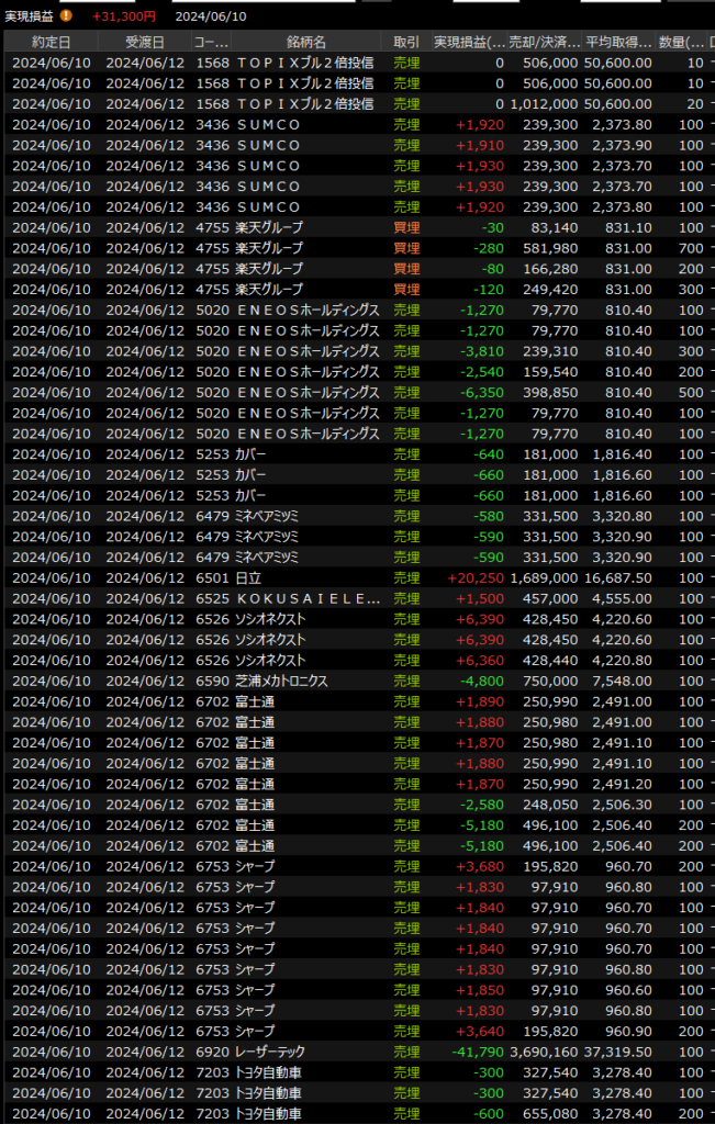 デイトレは買いで勝てずに前場後半ポジション完済(+1万)してドテンショート。これも後場寄りであきらめて(▲1万)、再び買い直し(+3万)。下手な売り買いを繰り返して機を逃したような悔しさはありますが、ショートに固執しなかったのは成長かな。ひさびさに逆指値を完璧に機能させたのも良かったです。