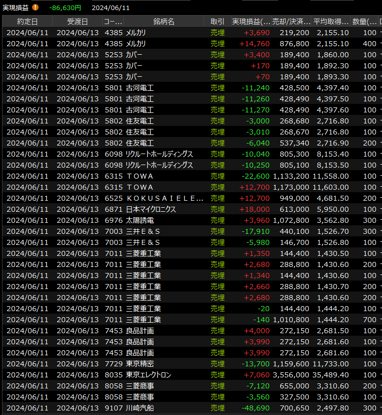 デイトレは前場後半までは収支ほぼトントンだったのですが、いろいろな銘柄がストップロスにかかり、さらには前場後半に買った川崎汽にストップかけ忘れて気づいたらなかなかの損失に。勝ち銘柄も多かったですが、負け銘柄の負け方が派手で終わってみれば完敗の一日でした。