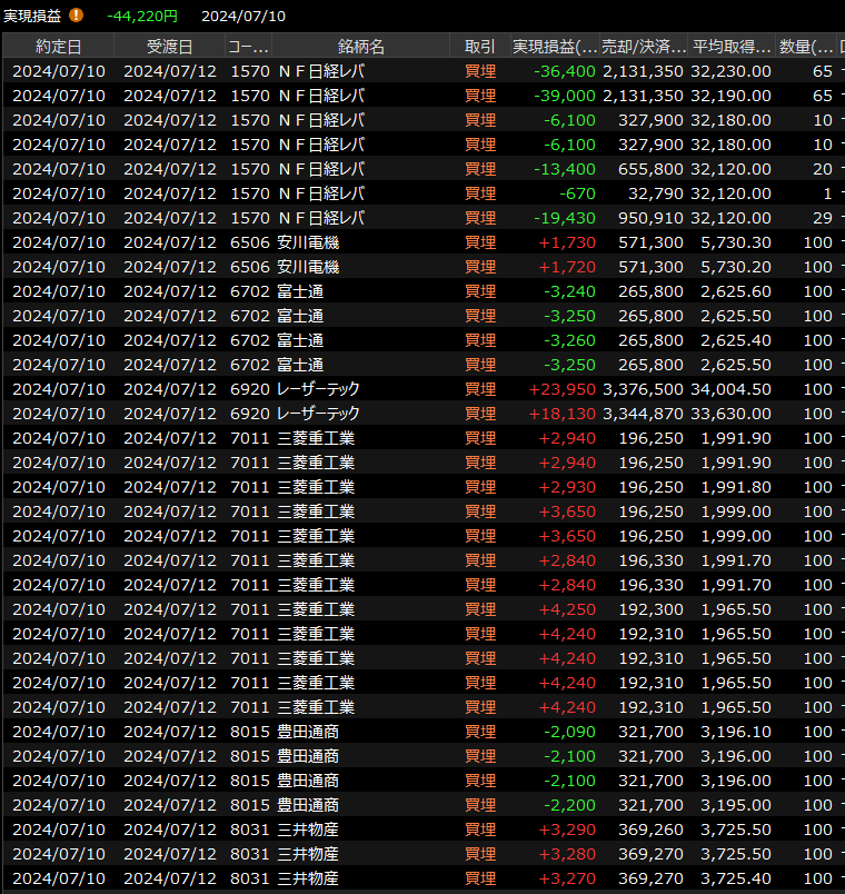 デイトレはショートだけ。重工やレーザーなどそこそこうまくいった銘柄もあったのですが、全力でショートした日経レバが後場にかけてとことん担がれて勝ち目なし。