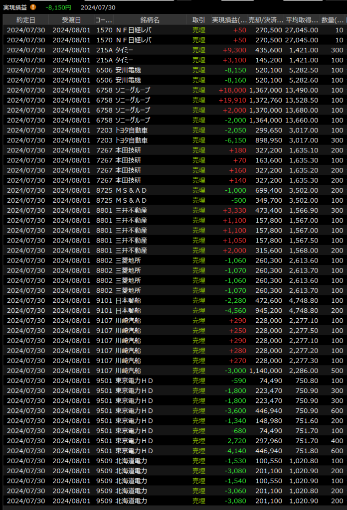 デイトレはバリューなどに逃げましたがその後上げ渋る銘柄ばっかりで今日も冴えず。中でも電力と海運の不発は痛く、両方高いところを買っていただけに厳しくなりました。