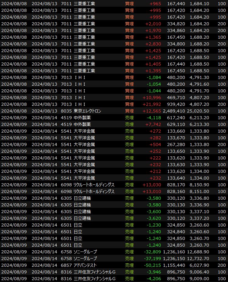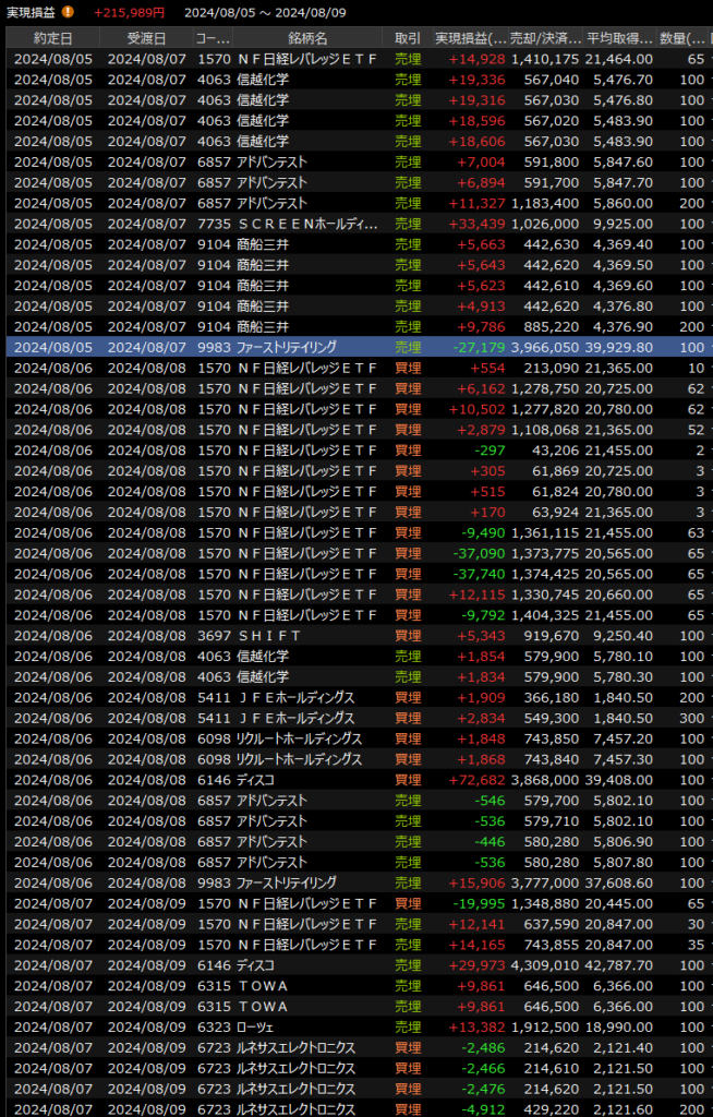 実際にはショートの踏み上げや細かいミスで負け取引も多いのですが、それでもこれだけのボラティリティの中で何とかプラスを維持できたのは大きいです。一応、月から金の取引履歴を添付します。この連休以降は落ち着いてしっかりと向き合った取引をしていきたいと思います。