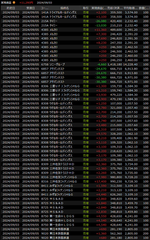 デイトレは結構金融に資金をシフトしたつもりで、メルカリとかもやったのですが、半導体が反発した時に最初にきそうで結構買ってたアドテスト1銘柄で11万以上やられて積みました。タイミーの高値をひっかけてしまった(▲4万)のも痛かったです。辛うじてプラス着地。