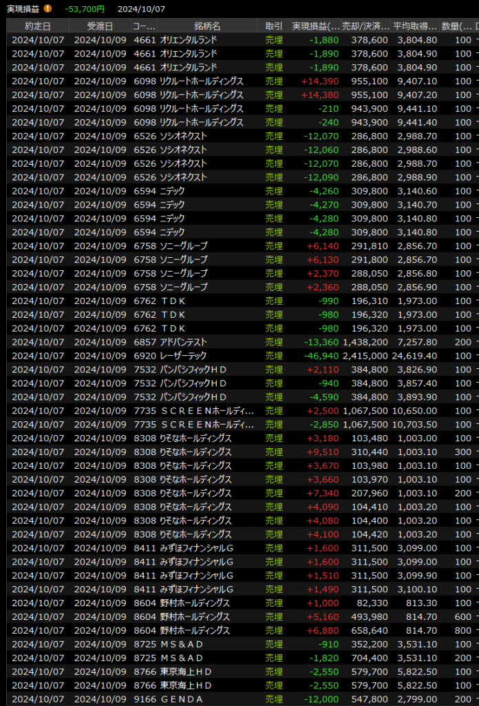 デイトレはレーザー、ソシオ、アドテストなど半導体を多く握ったので完全に負け戦になってしまいました。ディスコは売りも朝だけかな、と思いましたが前場いっぱい売られて時間と共に他の半導体がつれ安する羽目に。後場は収支プラスで逃げられる局面多かったですが、ラスト20分でマイ転。最近引けにかけて損益悪化する日が多すぎ。