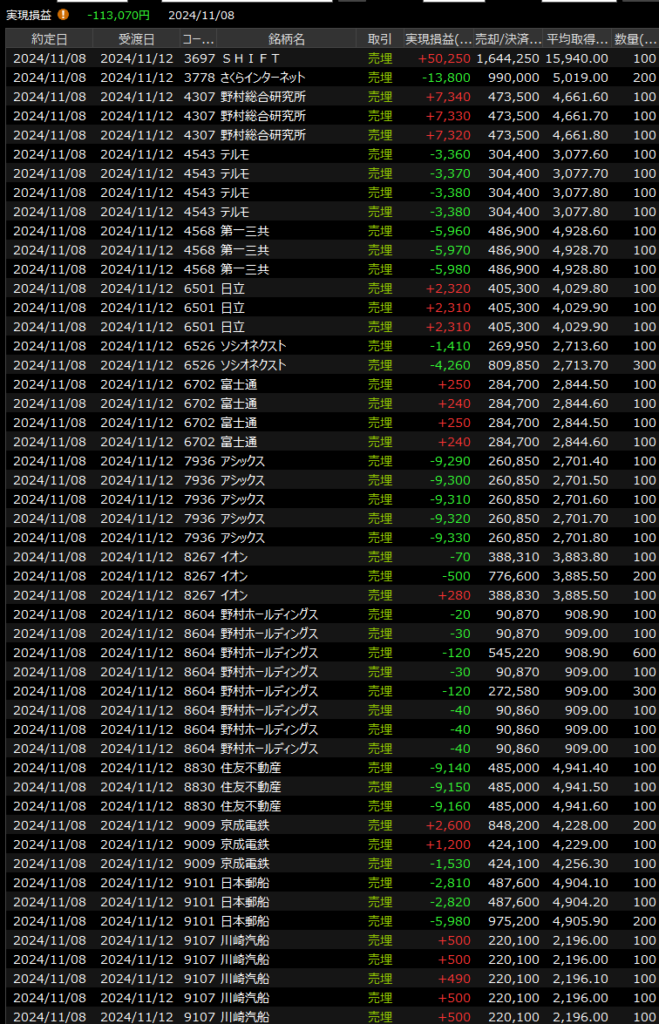 デイトレはこれぞという銘柄をいろんなセクターから集めてリスク分散気味にポートフォリオを組んだのですが、アシックスがまさかの後場場中決算で一時急落。下ひげはつけましたが結果的に今日の戦犯になってしまいました。いずれにしても負け銘柄が多すぎでした。