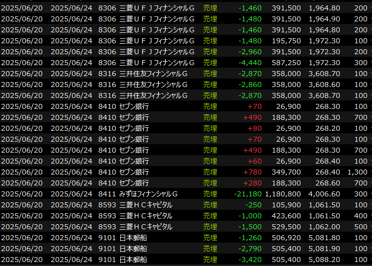 デイトレはアドテストだけうまくいきましたが、途中から売った半導体資金で銀行など他セクを増やした結果裏目に。最終的には持ち株がすべて含み損状態で引けの決裁を迎えました(しかもラスト5分でさらに結構やられたし…)。