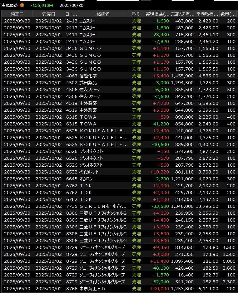 9/29(月)権利落ち分ごっそり下げ 2025.09.29