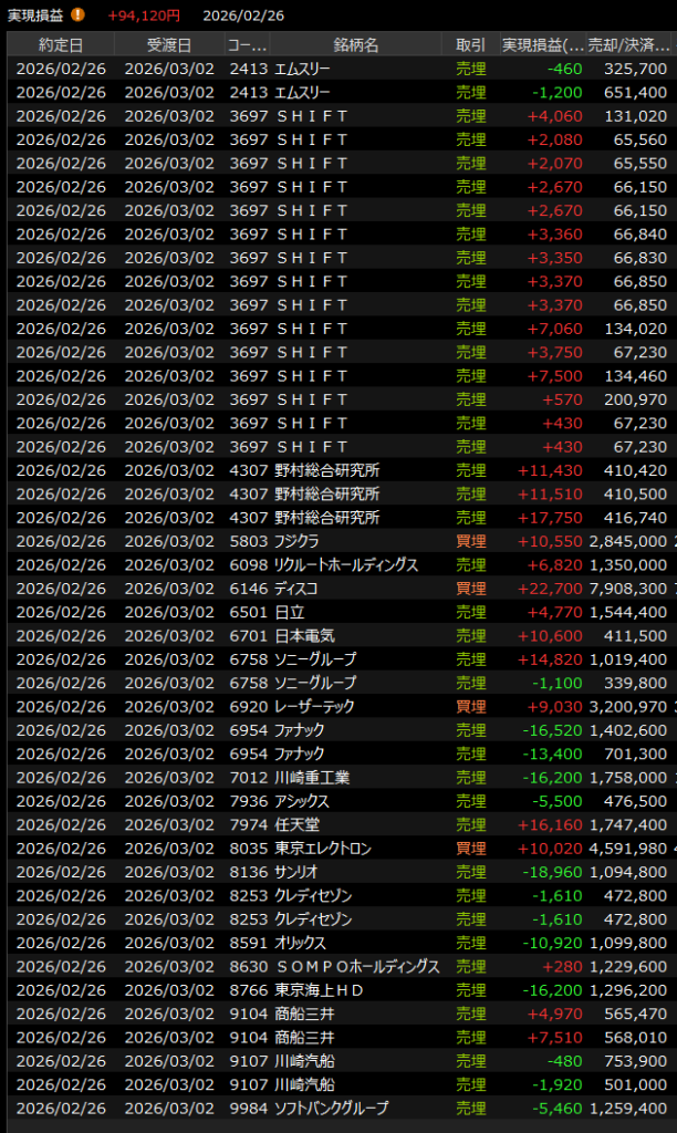 デイトレは寄り直後に少し半導体のショートでとった後は昨日負けたソフトウェア関連を中心に。あいかわらず後場に損益を悪化させまくって反省ですが、任天堂、ソニー、野村総研などで勝つには勝ちました。